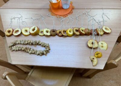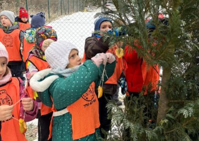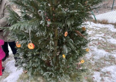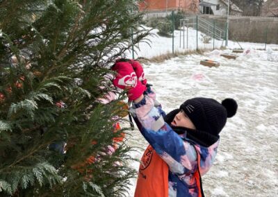 Ve žlutém vagónku děti vytvořily krásné ledové ozdoby z přírodnin. Díky velkému mrazu zmrzly a už zdobí prostor předzahrádky u vstupu z ulice.