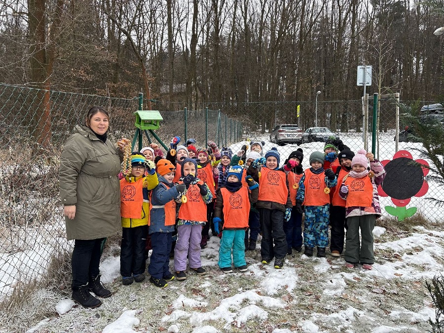Děti z oranžového vagónku nachytaly ptáčkům něco na zub.