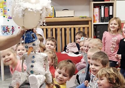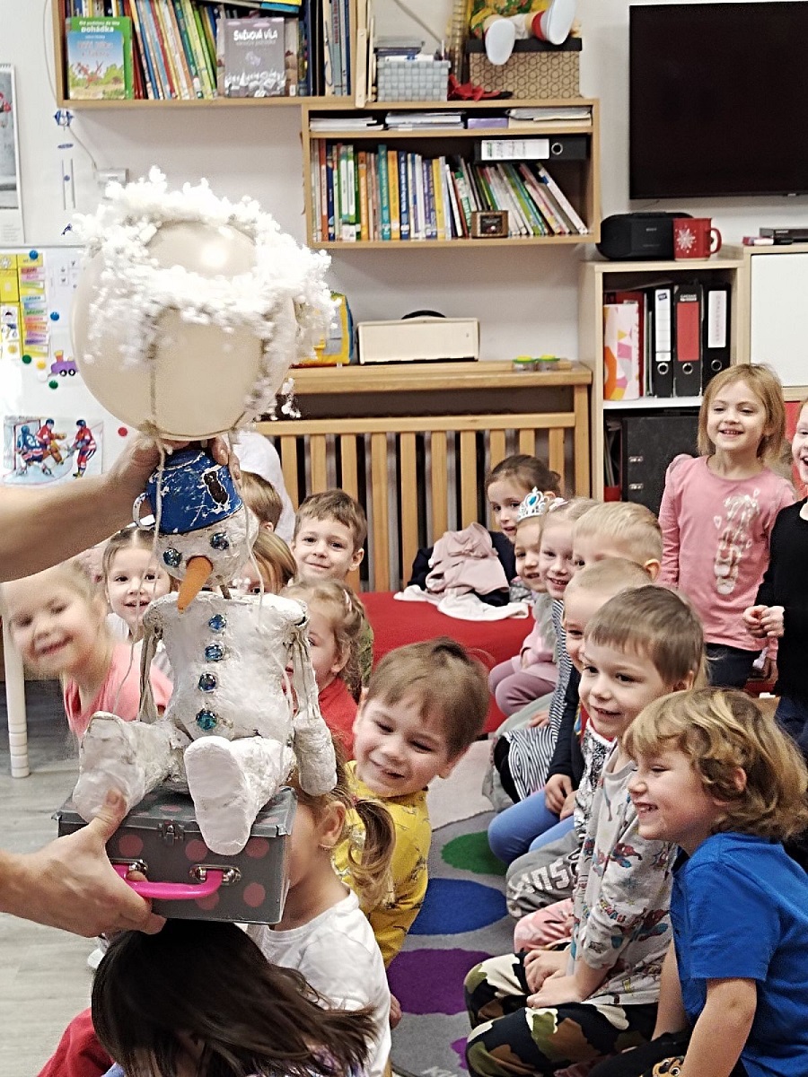 V úterý 20. ledna přijel za dětmi ze žlutého, červeného a modrého vagónku Dominik z Divadla 100 dortíků, aby dětem zahrál příběh o pejskovi a sněhulákovi.
